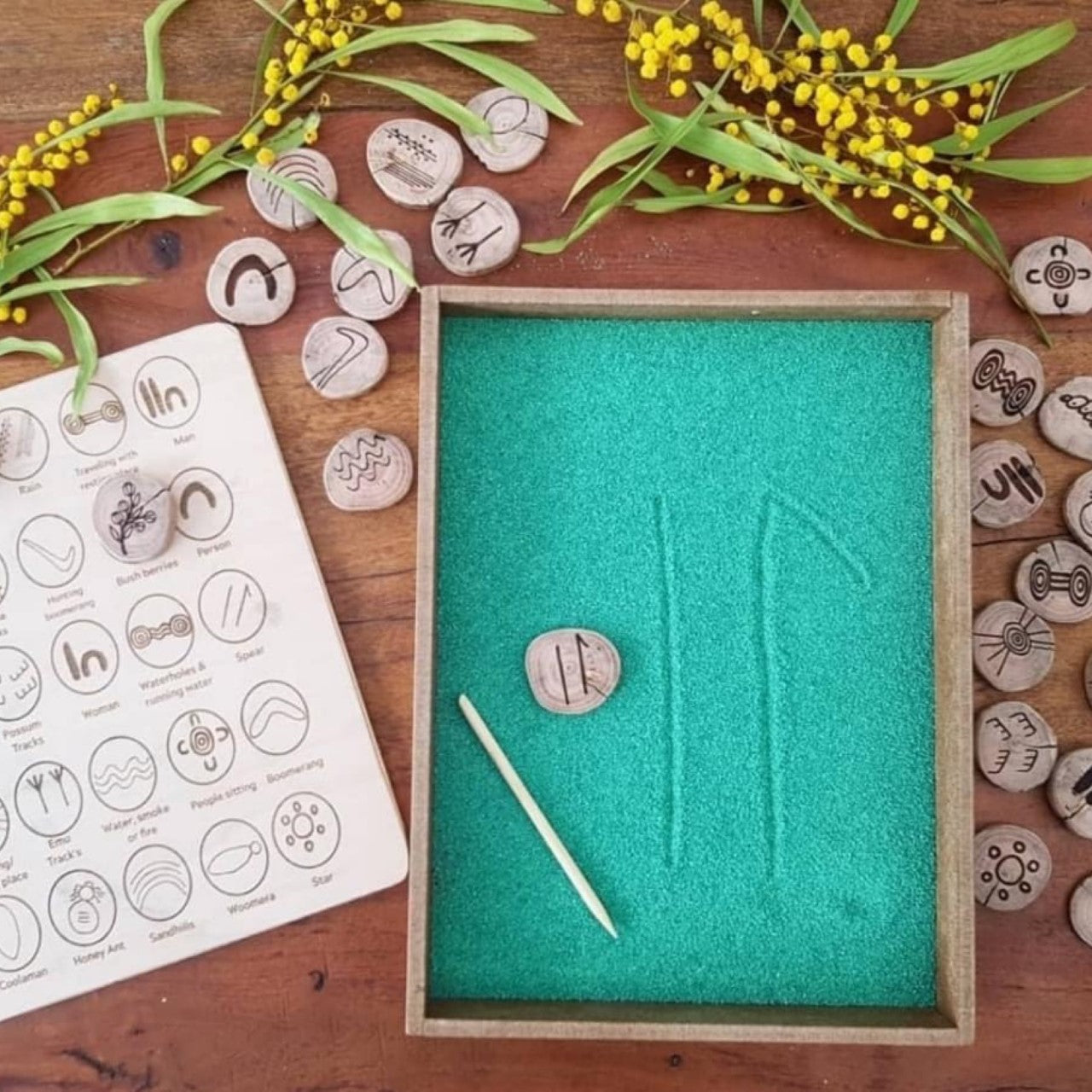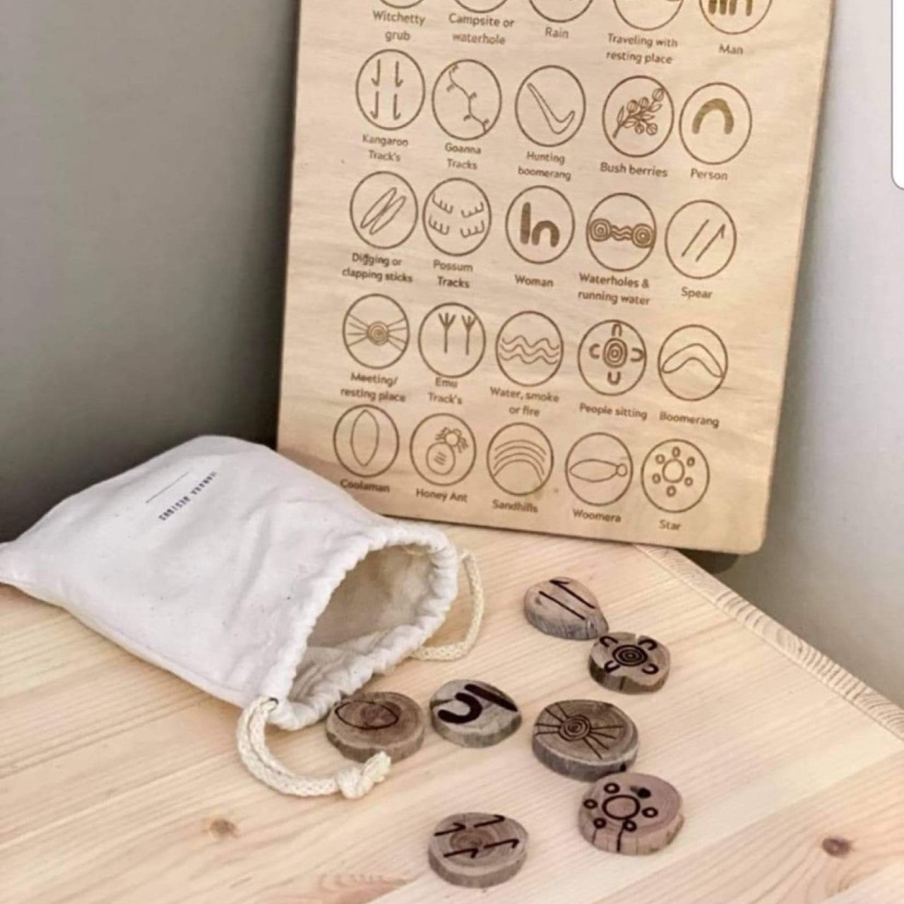 ( Our first nation people would engrave symbols into sticks and other wooden objects to leave a message or tell a story. This was their form of communication & the design concept behind the game ).