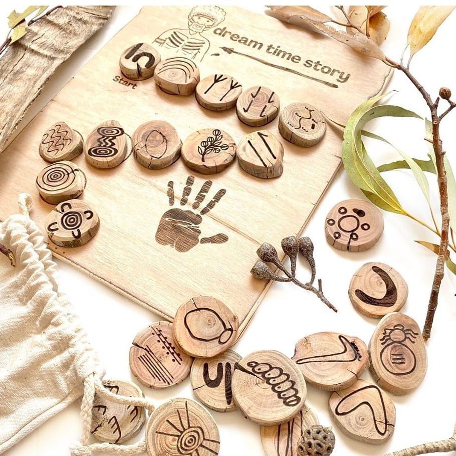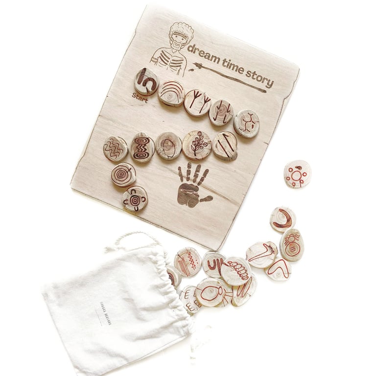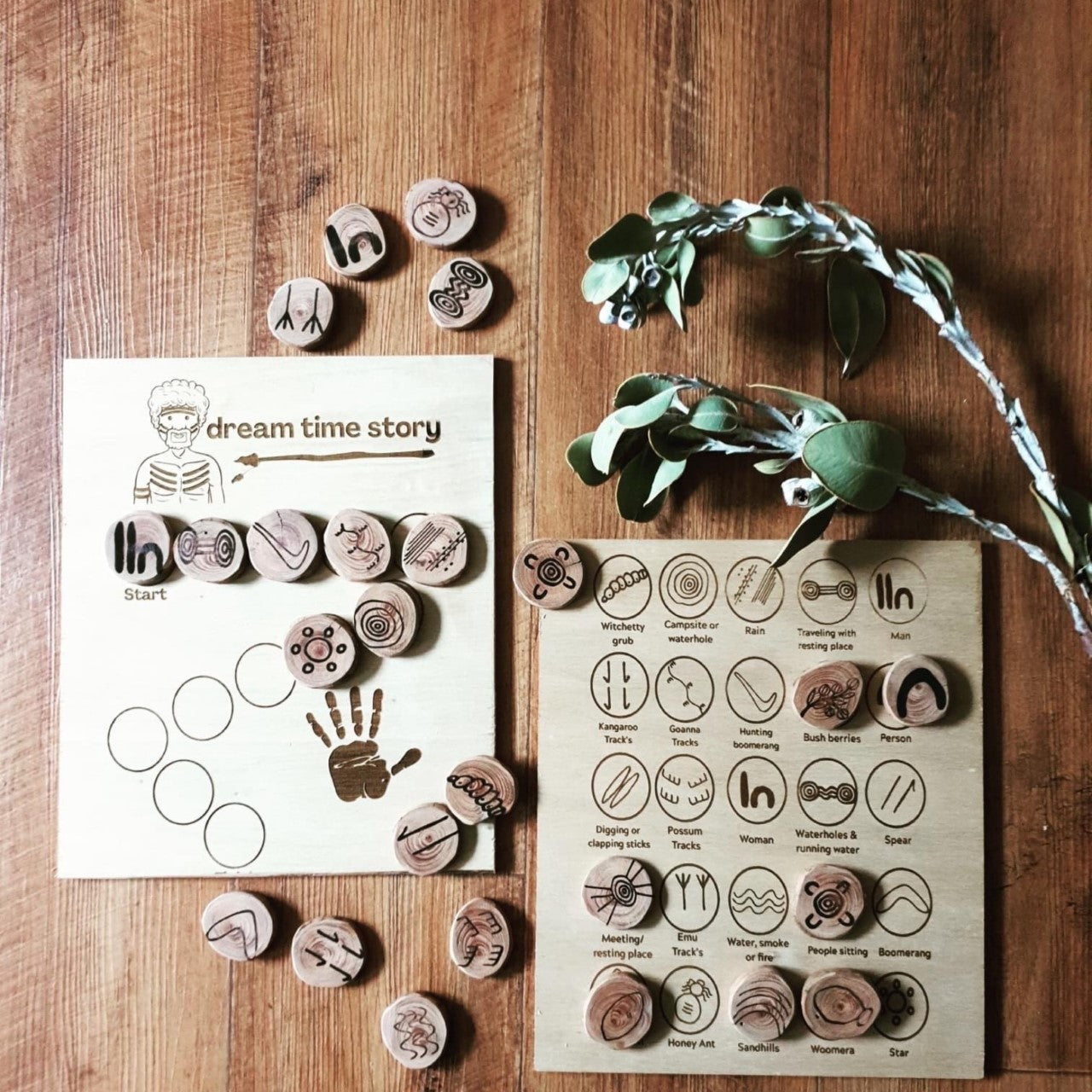 Aboriginal symbols are a form of communication used by our first nation people for thousands of years. Still to this day we express our stories through symbols in artworks. We have designed our symbol matching game to become familiar with the symbols by corresponding the pieces to the board. Our Dreamtime story board has been designed to map out your own story by placing the symbols along the path and corresponding back to the symbol meaning to create your story.