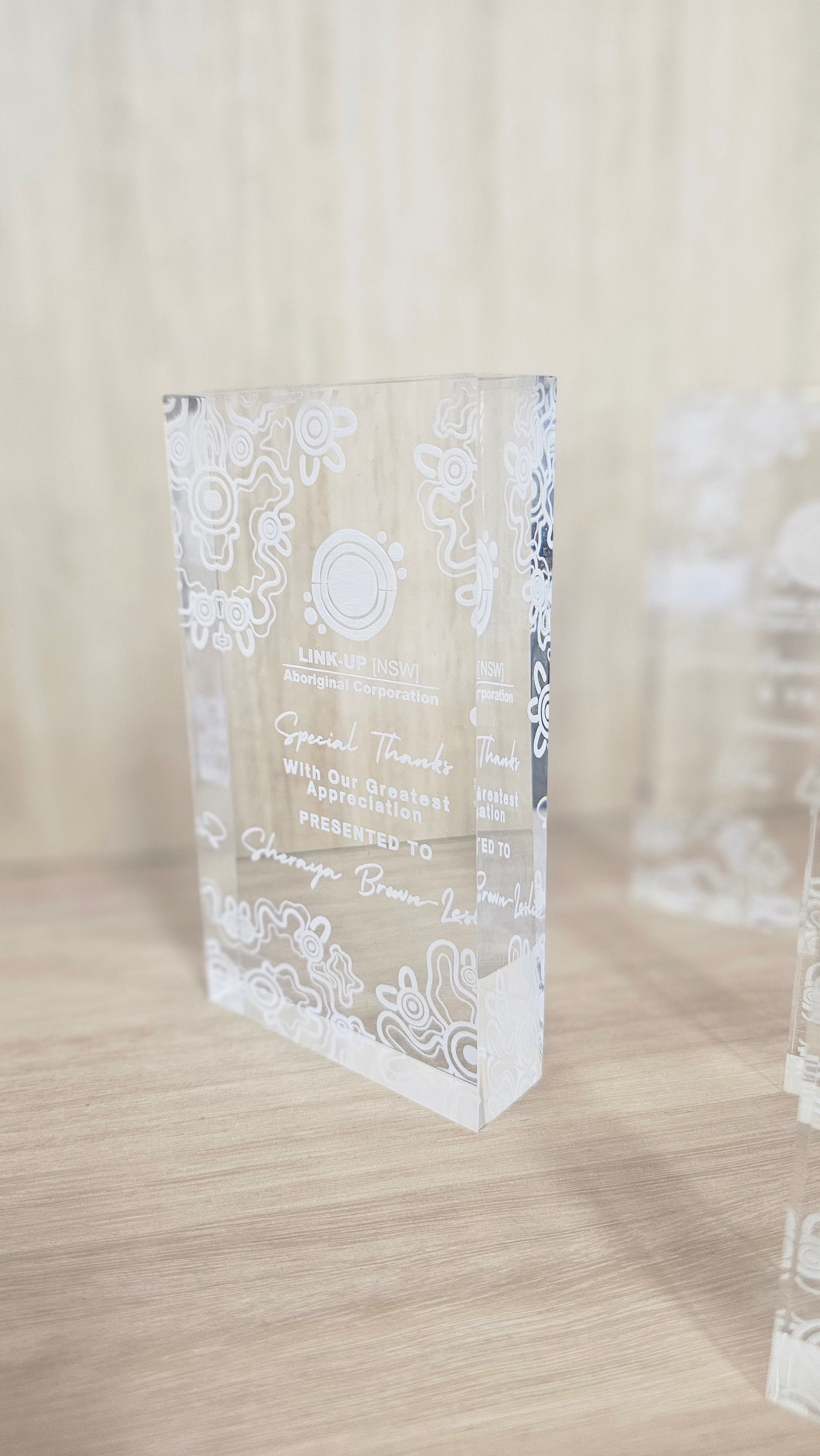 | This award features Aboriginal art engraved onto a clear acrylic block, combining cultural storytelling with a modern, elegant finish. The transparent acrylic highlights the engraved artwork, symbolising strength, resilience, and connection while allowing light to shine through, giving the piece a timeless and sophisticated presence. Each design draws on Aboriginal culture, celebrating stories of Country, community, and connection, making it a meaningful and respectful way to honour achievement and recognition. - Drafts will be emailed to confirm the artwork - Large order qty can be arranged please email us Sizing - 140mm high x 80mm x 25mm thick |
