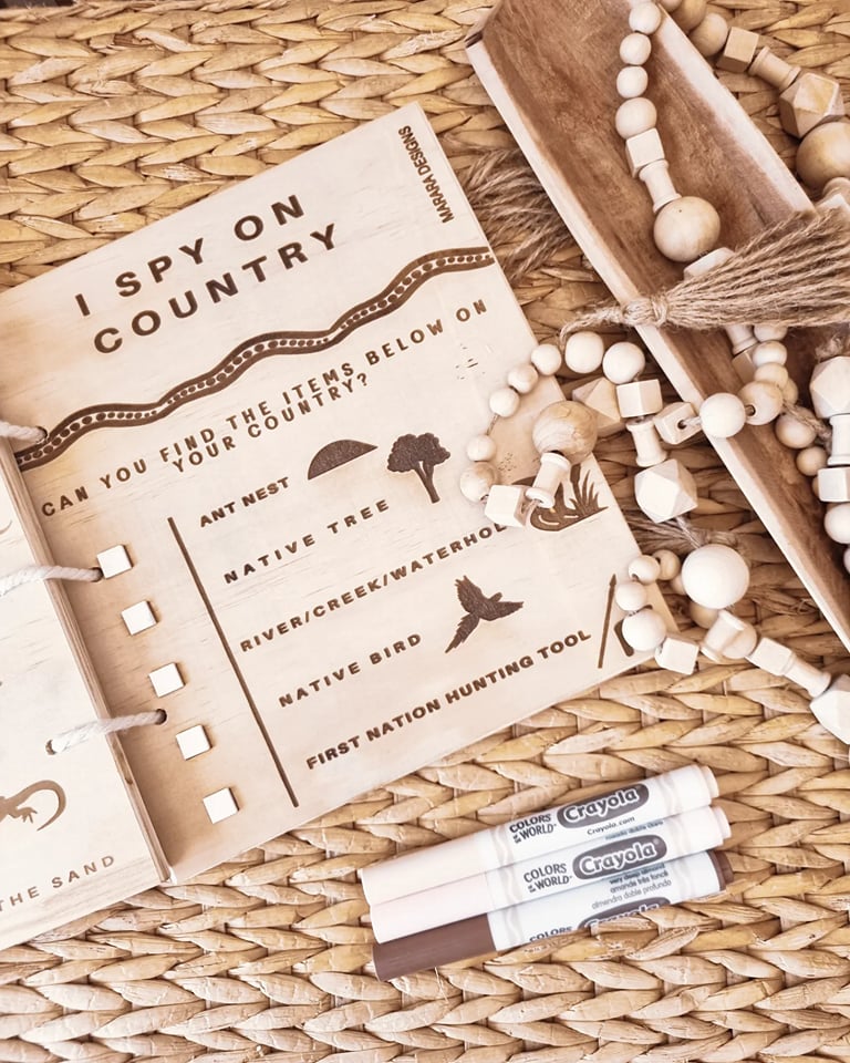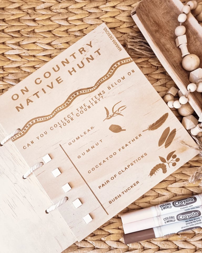 The aim of the book is to be out on Country discover and find the things in the book along the way & mark them off. Find a stick that can be a hunting tool, a pair of clap sticks. Find some bush tucker native to your Country, along with more activities!