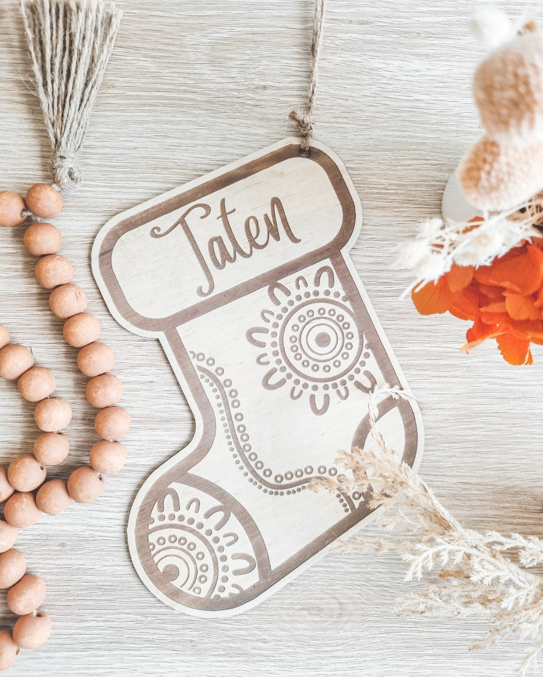 Personalised Aboriginal designed Christmas stocking cutout, decorate the house this Christmas with your family members names on our wooden Aboriginal stocking design!