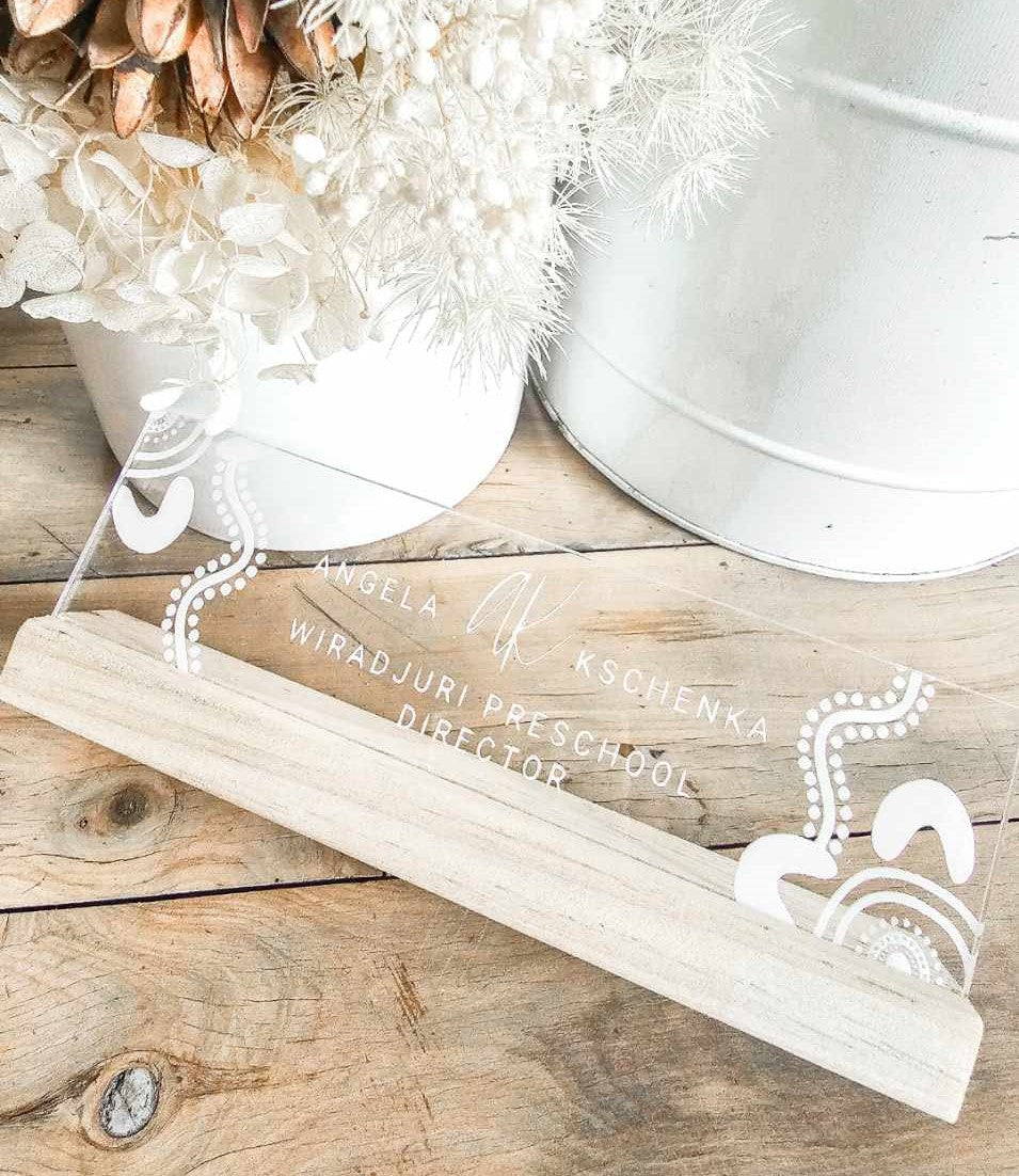 Our clear acrylic name plates with wooden stand makes the perfect addition to any desk.