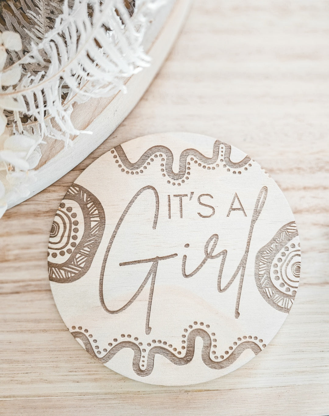 Aboriginal designed baby plaque is perfect for announcing bubs gender, use the plaque in a cute photo announcement and as a keepsake for many years to come!