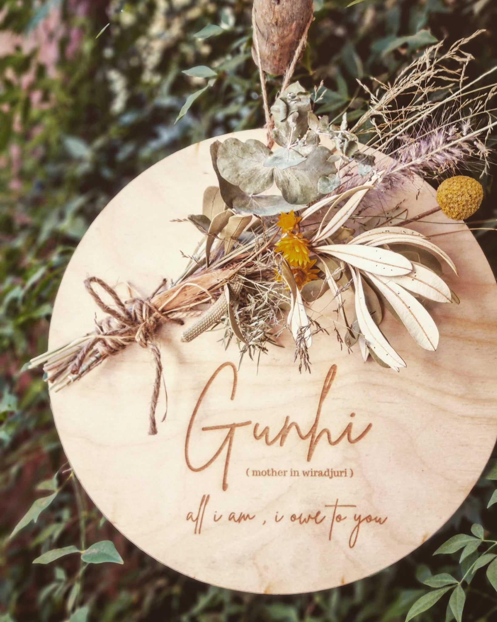 A everlasting wild bouquet hand picked on Wiradjuri Country (by the beautiful Teisha Robinson) & our wooden sign together make the perfect gift for your Gunhi (mother).