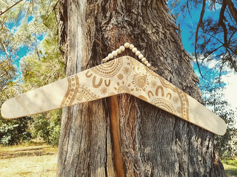 Inspired by my Children , each boomerang is natural wooden material that has been designed , handmade and engraved on Wiradjuri Country.