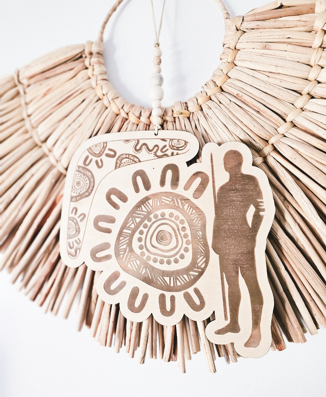 Artwork represents a warrior standing tall next to a campfire with family sitting around the fire. A Boomerang to represent returning (no matter where you go you will always return home)!