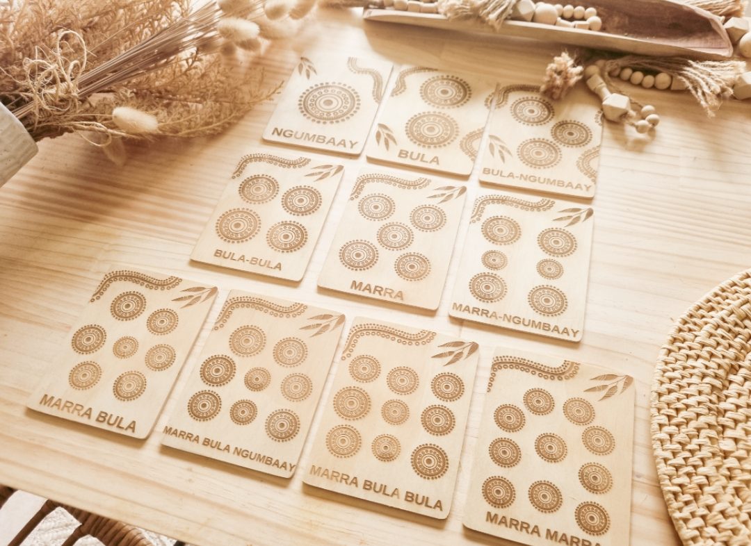 Wooden flash card in numbers 1 -10 in Wiradjuri language.
